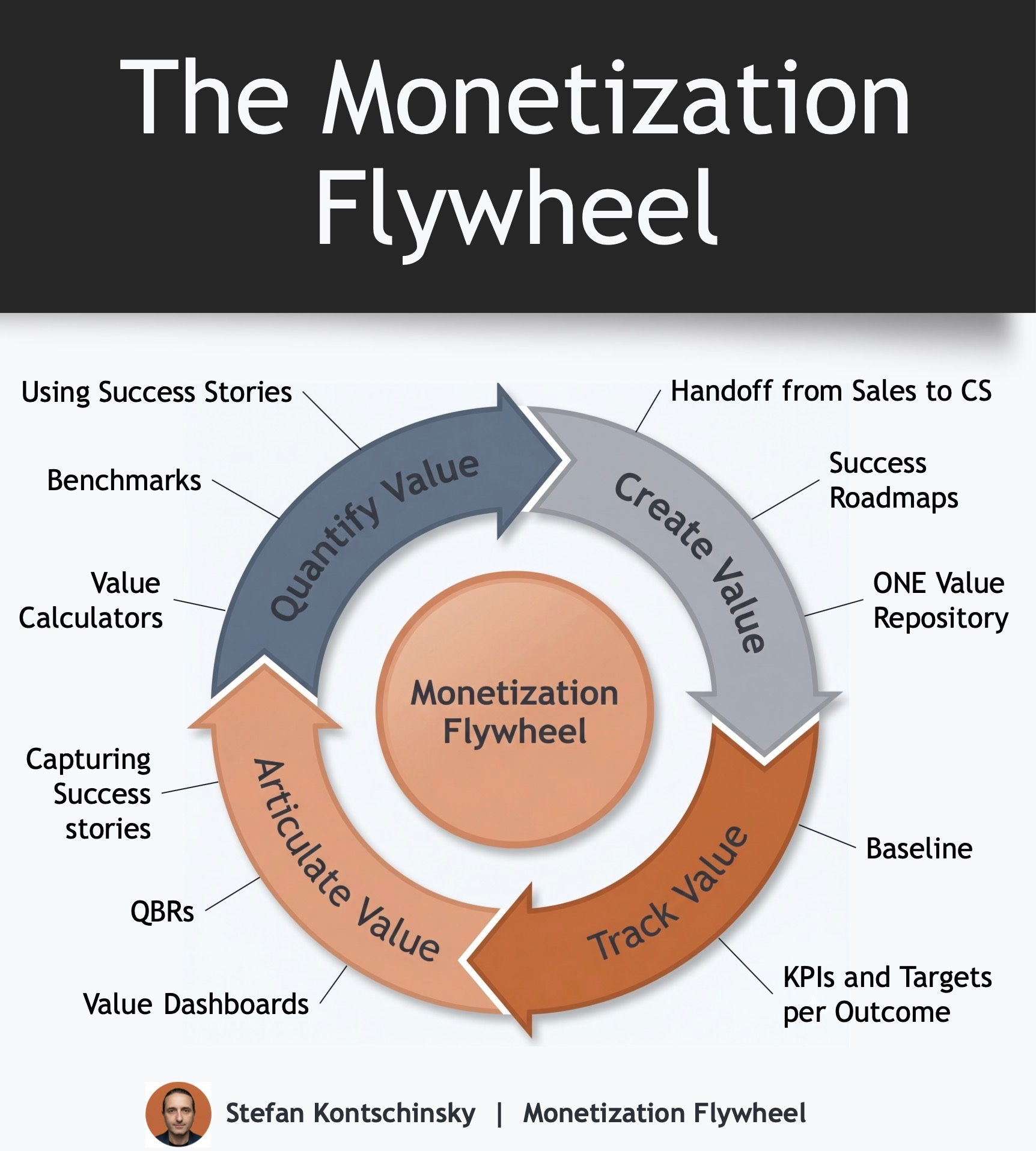 Marketing also needs to document proof points from one customer as inputs for the next prospects. Success stories with quantified outcomes, before-and-after metrics, and Executive’s quotes all strengthen the funnel and help close the next deal. That is how the Monetization Flywheel comes to spin. Value delivered to one customer becomes the proof point for the next one.